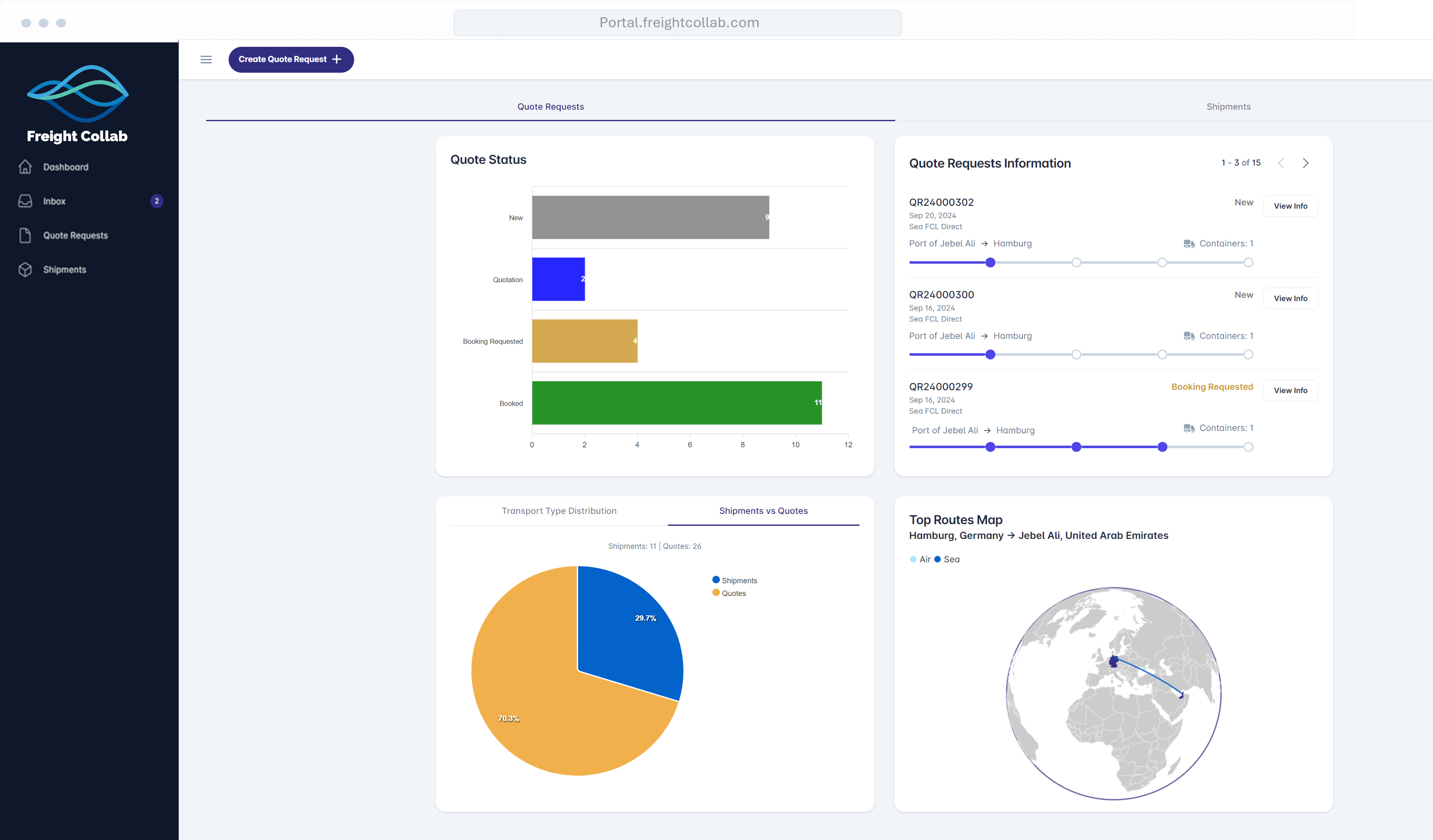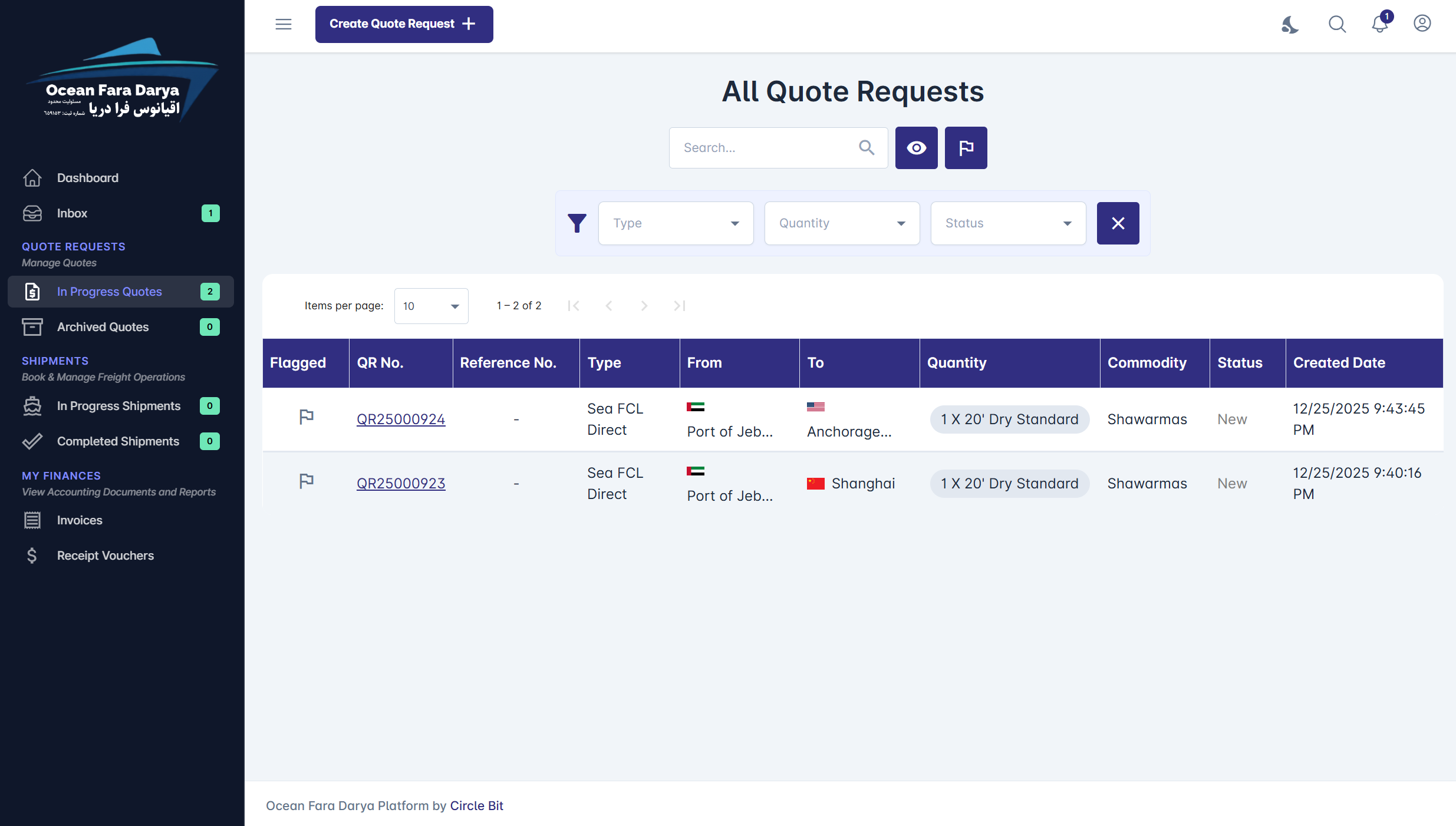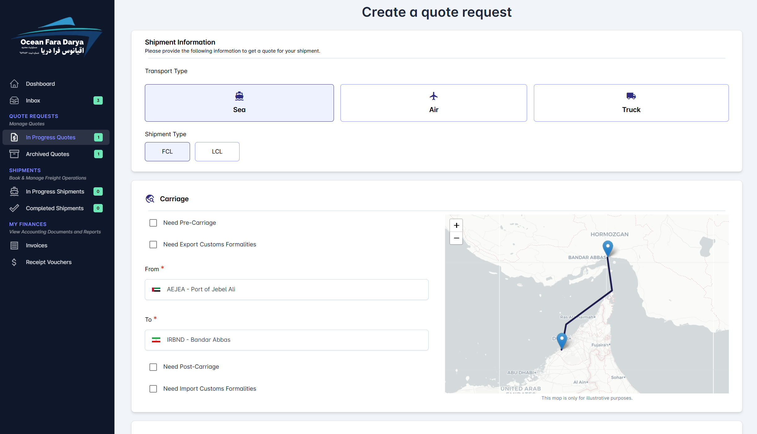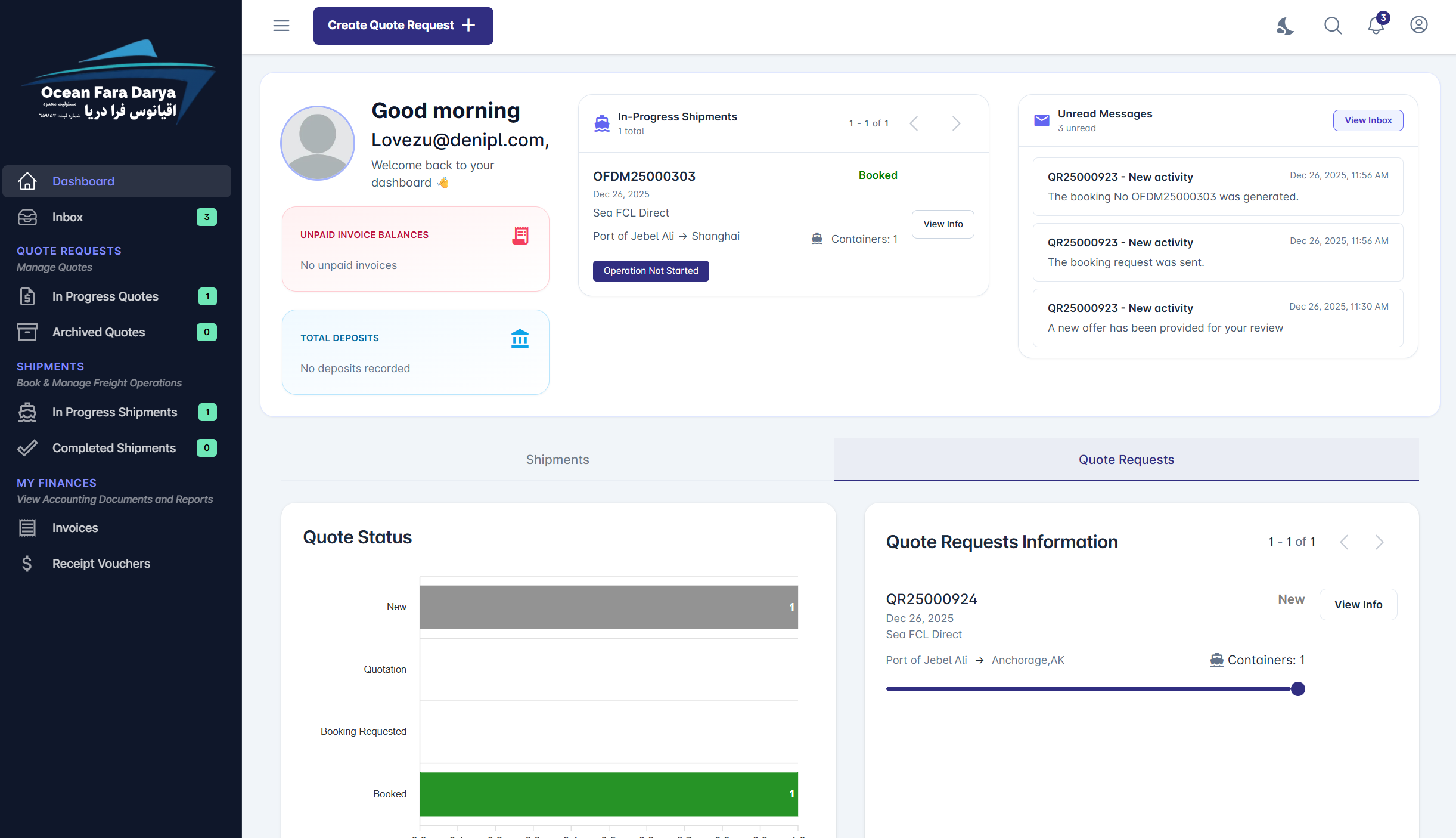 The Ocean Fara Darya Customer Portal is a powerful all-in-one digital platform designed for freight buyers—including shippers, manufacturers, traders, and even freight and logistics companies—who want seamless access to the best shipping and logistics services. Through the portal, customers can easily get competitive quotes, book and manage all their shipments, and enjoy Ocean Fara Darya’s excellent shipping experience in one place. Beyond shipment management, the portal also provides full financial visibility, enabling customers to access invoices, receipts, and statements of account while managing Freight Financing and Credits directly within the platform.
