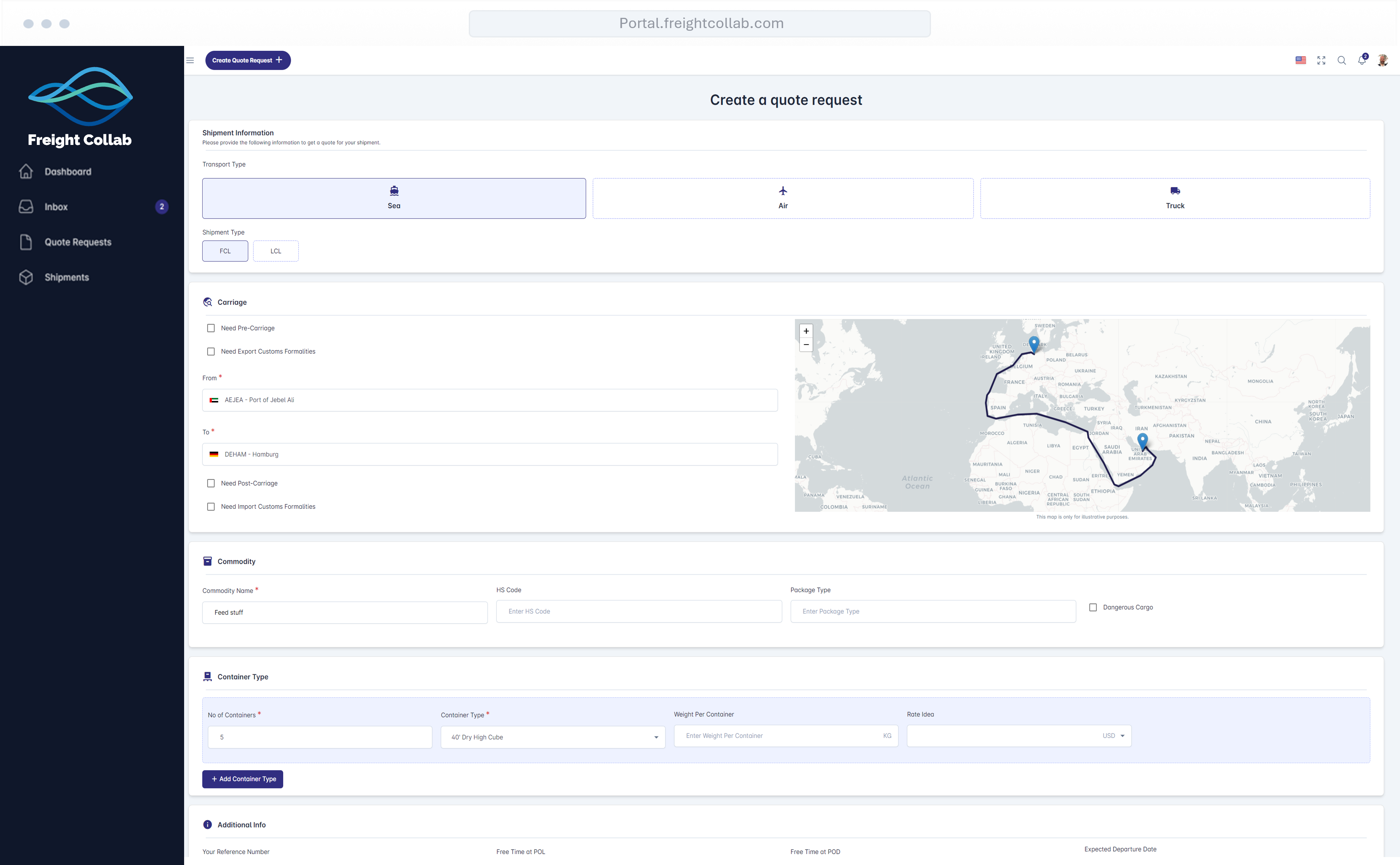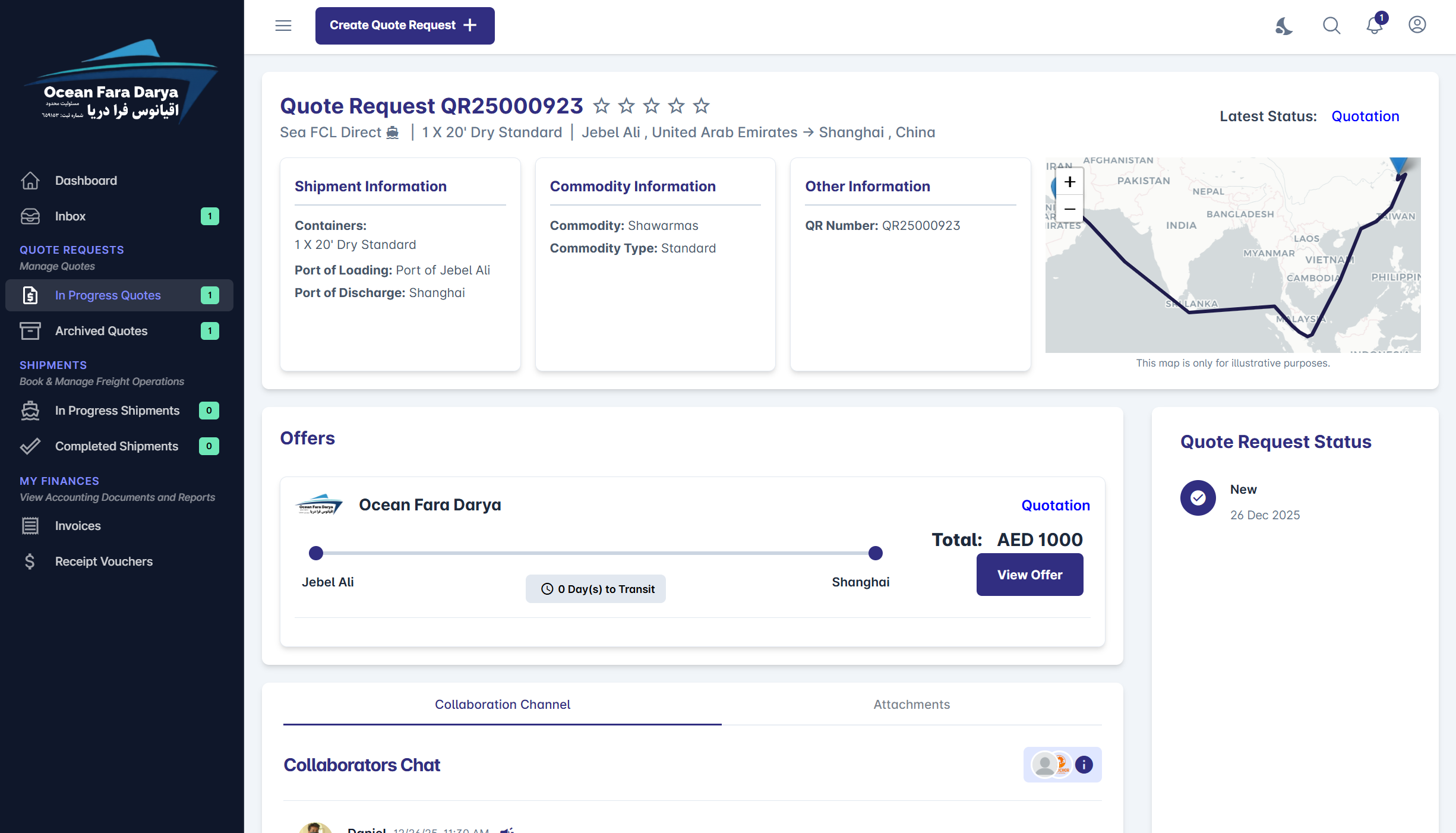 The Ocean Fara Darya Customer Portal is a powerful all-in-one digital platform designed for freight buyers—including shippers, manufacturers, traders, and even freight and logistics companies—who want seamless access to the best shipping and logistics services. Through the portal, customers can easily get competitive quotes, book and manage all their shipments, and enjoy Ocean Fara Darya’s excellent shipping experience in one place. Beyond shipment management, the portal also provides full financial visibility, enabling customers to access invoices, receipts, and statements of account while managing Freight Financing and Credits directly within the platform.